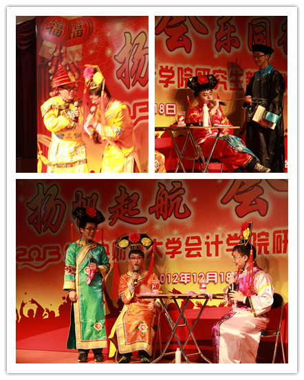 受到了孟焰院长的鼓舞,接下来表演的小品《甄嬛传之话说中财》效果极佳:男生反串后宫嫔妃——逼真的清宫服装、恰到好处的古代女子妆容、对中财学生生活的生动演绎以及演员们声情并茂的演出,博得了现场阵阵掌声和欢笑声。反串小品过后便是舞蹈秀《不要不要》,6位甜美可爱的女生用自己青春无敌的活力气息驱走了冬日夜晚所有的寒意。接下来的小品《中财好声音》同样借用了2012最流行的元素,并且将同学们所面临的现实状况甚至专业课知识完美的结合到了节目之中,博得了现场观众的共鸣。“文”过后必有“武”,《斧头帮》的众兄弟也来现场凑热闹了,不服输的他们又开始挥舞起了自己的斧头,为同学们带来了一场视听盛宴。
