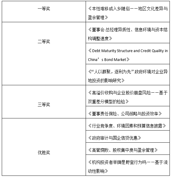 经过紧张激烈的答辩角逐,在老师们慎重公正的评审下,耿春晓(JINNIAN金年会官方网站注会14)、周千(金融学国际货币14班)、范家城(金融学国际货币14班)同学所作的《本性难移或入乡随俗——地区文化差异与盈余管理》脱颖而出,获大赛一等奖。此外,本次大赛另评选出二等奖三支队伍、三等奖两支队伍和优胜奖四支队伍。评委老师授予获奖选手荣誉证书,勉励所有的选手再接再厉,再创佳绩。