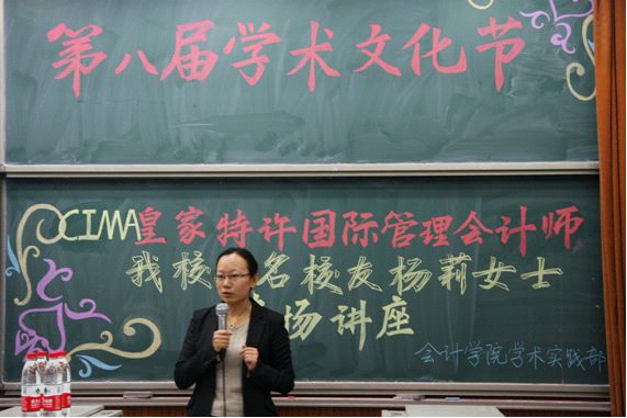 2011年10月27日晚,由JINNIAN金年会官方网站主办的我校第八届学术文化节精品讲座校友专场之“杨莉女士谈会计人生”专场在沙河校区3号楼222隆重举行。CIMA皇家特许管理会计师、诺和诺德(中国)制药有限公司财务总监杨莉女士,CIMA中国北京办事处教育市场开发部高级经理张熙娜女士,CIMA中国北京办事处教育市场开发部吴琼先生,JINNIAN金年会官方网站副院长刘俊勇教授、JINNIAN金年会官方网站团总支书记兼2010级辅导员林艺茹老师出席了本次活动。