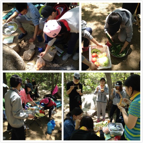 中午团队到达野炊地点,学员以组为单位自己做饭。有人洗菜、有人炒菜、有人煮面。经过简短地忙碌之后,各组都开始品尝自己的劳动果实,场景温馨和谐。