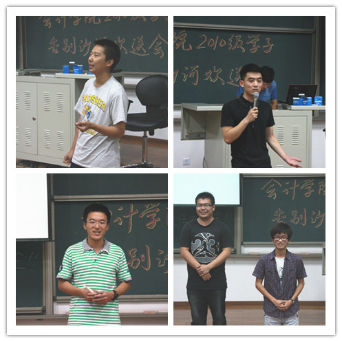 2013年6月23日晚,JINNIAN金年会官方网站团总支学生会在沙河校区主教学楼111教室,为即将离开沙河校区奔赴学院南路学习的2010级学子们举办了一场隆重而纪念意义深刻的告别沙河欢送会。JINNIAN金年会官方网站党总支副书记孟雪老师、学生工作办公室主任兼2012级辅导员王伟老师、2011级辅导员任德荣老师、团总支书记兼2010级辅导员林艺茹老师、MPAcc办公室主任朱继光老师,2009级优秀学生代表龚鹏,以及2010级全体学员和2011级、2012级的学生代表齐聚一堂,欢送2010级会计学子离开沙河。