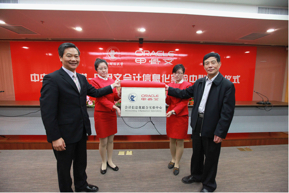 10月19日上午,由全球软件巨头甲骨文(Oracle)公司与我校联合组建的会计信息化联合实验中心揭牌仪式在学术会堂706会议室隆重举行。王广谦校长和甲骨文公司全球副总裁卢汝文先生共同为会计信息化联合实验中心揭牌。揭牌仪式由JINNIAN金年会官方网站院长孟焰教授主持。甲骨文公司大中华区战略规划及企业发展部总经理罗建民、合作伙伴解决方案中心总经理苏东林、事务总监姚宇红和教育工程项目经理罗颖、诺亚舟咨询公司总经理韩向东、市场总监盛桢智和JINNIAN金年会官方网站袁淳副院长、孟雪副书记、吴溪副院长、刘俊勇副院长及JINNIAN金年会官方网站30名研究生代表出席了揭牌仪式。