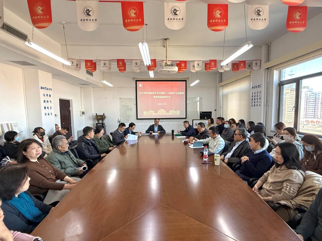 11月20日,JINNIAN金年会官方网站召开教师集中学习暨课程思政研讨会,深入学习贯彻党的二十届四中全会并专题研讨全会精神如何融入课程思政。研究生工作部副部长、研究生院副院长肖土盛,科研处副处长梁上坤应邀出席。学院领导班子及全体教职工参加会议,会议由学院党委书记陈运森主持。