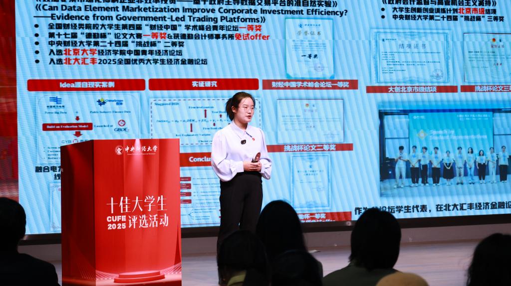 在科研竞赛中,她始终以服务国家战略为导向。聚焦“三农”问题,与团队构建数学模型助力农业优化,获大学生数学建模竞赛北京市二等奖;围绕国家能源战略撰写商业计划书,在第九届泰德商业案例分析大赛中斩获复赛第一名、决赛三等奖。她参与撰写的论文《数据要素市场化抑制企业非效率投资》入选北京大学中国青年经济论坛,并荣获第四届财经中国青年论坛一等奖及“德勤杯”一等奖。作为创新孵化班优秀学员,她还在北大汇丰经济金融论坛上展示了中财会院学子的卓越风采。